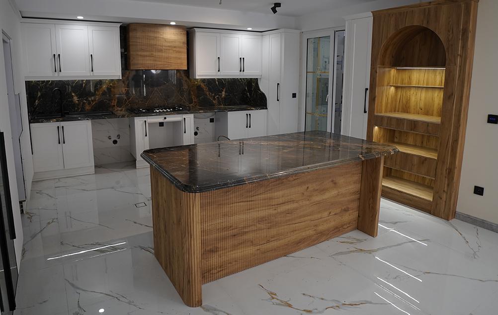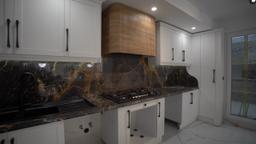 سنگ مرمریت گلدن گلکسی یک سنگ با ترکیب رنگی مشکی و رگه های سفید و طلایی است، این سنگ یک سنگ ایرانی است که از معادن کشور عزیزمان ایران استخراج میشود. سنگ مرمریت گلدن گلکسی یکی از انتخاب های خوب برای صفحه کانترتاپ است. این سنگ یک سنگ فوق العاده لاکچری است در منازل و محیط های لوکس بسیار استفاده میشود. پروژه صفحه کابینت آقای خلیق با سنگ گلدن گلکسی یک جلوه خاصی ایجاد کرده است که کمتر آشپزخانهای این طرح را دارد.